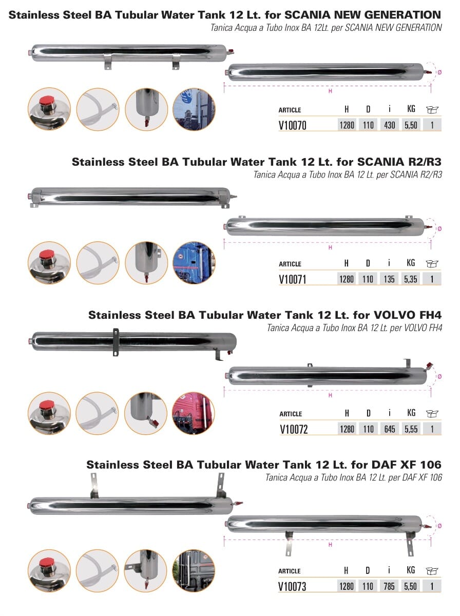 La tanica acqua a tubo in acciaio inox 304 BA lucido specchiato per camion trattori e motrici è la scelta ideale per garantire una conservazione sicura e duratura dell'acqua durante le lunghe rotte di trasporto. Realizzata in acciaio inox di alta qualità, questa tanica è progettata per resistere a condizioni di lavoro gravose, garantendo massima resistenza e longevità, anche in ambienti esterni difficili grazie al montaggio sulla parete posteriore della cabina. Completa di tappo e rubinetto in acciaio con tubo cristallo e fascetta bifilare inclusa per facilitare il lavaggio delle mani.